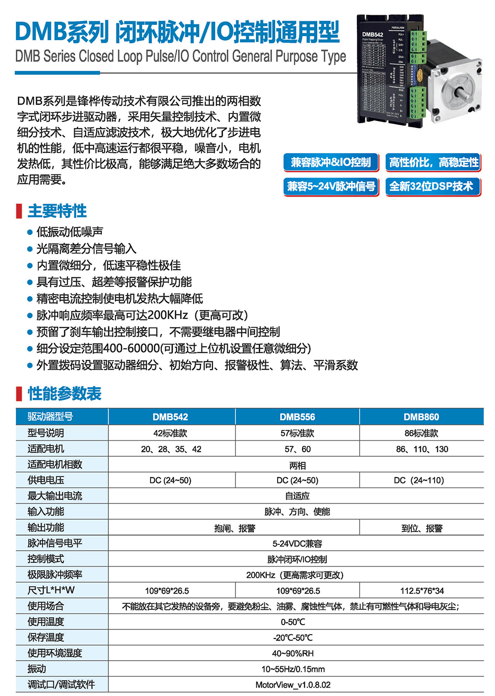 DMB系列是鋒樺傳動(dòng)技術(shù)有限公司推出的兩相數(shù)字式閉環(huán)步進(jìn)驅(qū)動(dòng)器,采用矢量控制技術(shù)、內(nèi)置微細(xì)分技術(shù)、自適應(yīng)濾波技術(shù),極大地優(yōu)化了步進(jìn)電機(jī)的性能,低中高速運(yùn)行都很平穩(wěn),噪音小,電機(jī)發(fā)熱低,其性價(jià)比極高,能夠滿足絕大多數(shù)場合的應(yīng)用需要。