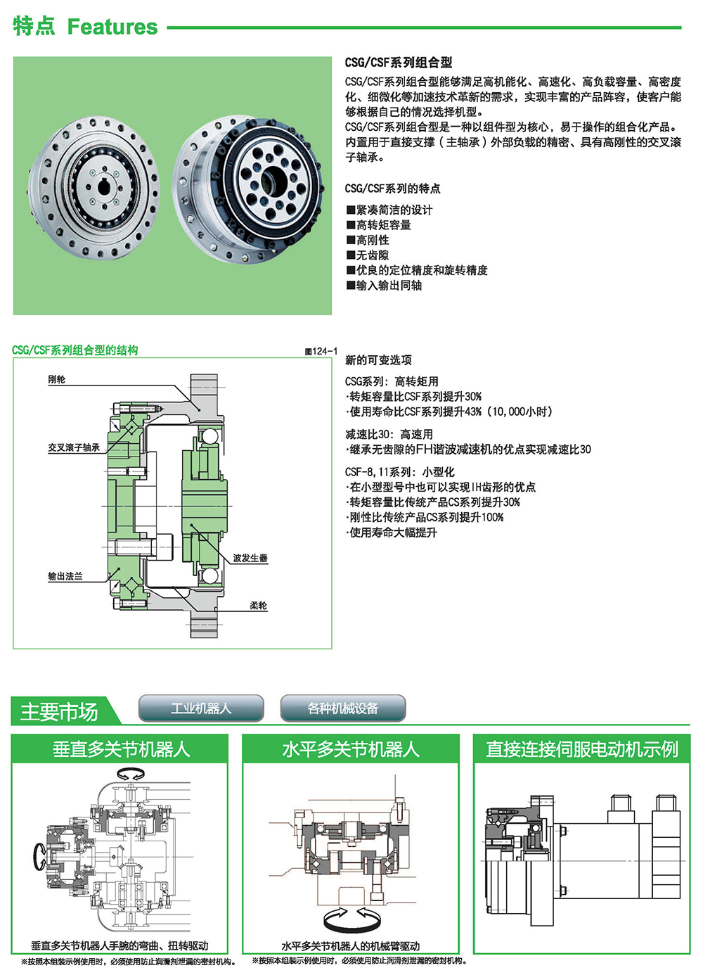 CSG/CSF系列組合型能夠滿足高機能化、高速化、高負載容量、高密度化、細微化等加速技術(shù)革新的需求,實現(xiàn)豐富的產(chǎn)品陣容,使客戶能夠根據(jù)自己的情況選擇機型。