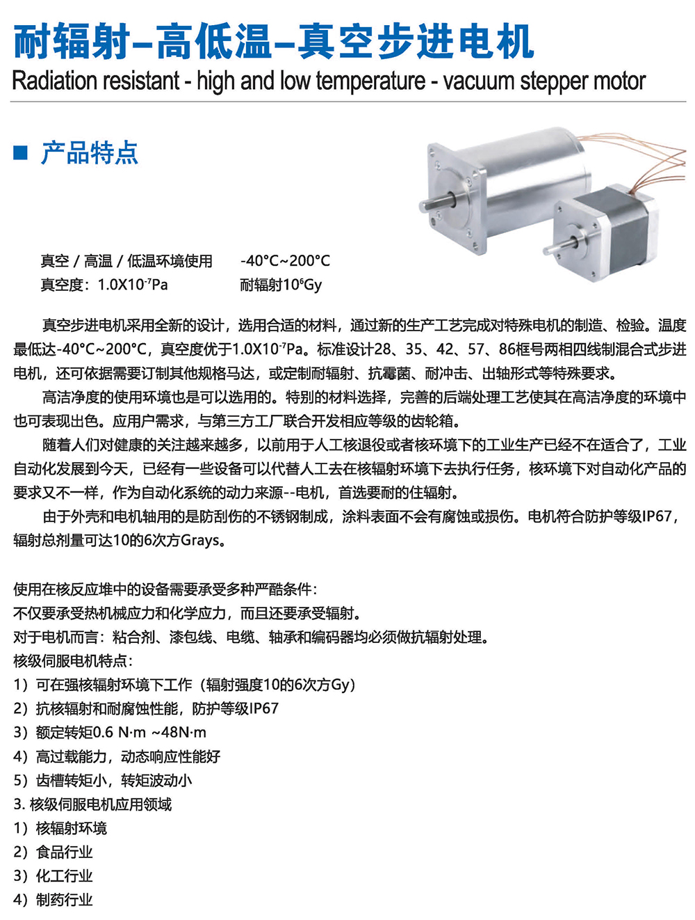 使用在核反應(yīng)堆中的設(shè)備需要承受多種嚴(yán)酷條件:不僅要承受熱機(jī)械應(yīng)力和化學(xué)應(yīng)力,而且還要承受輻射。對(duì)于電機(jī)而言:粘合劑、漆包線(xiàn)、電纜、軸承和編碼器均必須做抗輻射處理。