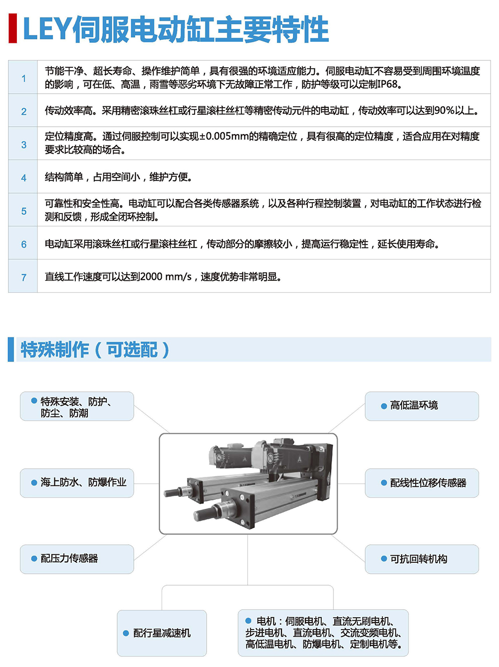 1.節(jié)能干凈、超長(zhǎng)壽命、操作維護(hù)簡(jiǎn)單,具有很強(qiáng)的環(huán)境適應(yīng)能力。伺服電動(dòng)缸不容易受到周?chē)h(huán)境溫度的影響,可在低、高溫,雨雪等惡劣環(huán)境下無(wú)故障正常工作,防護(hù)等級(jí)可以定制IP68。