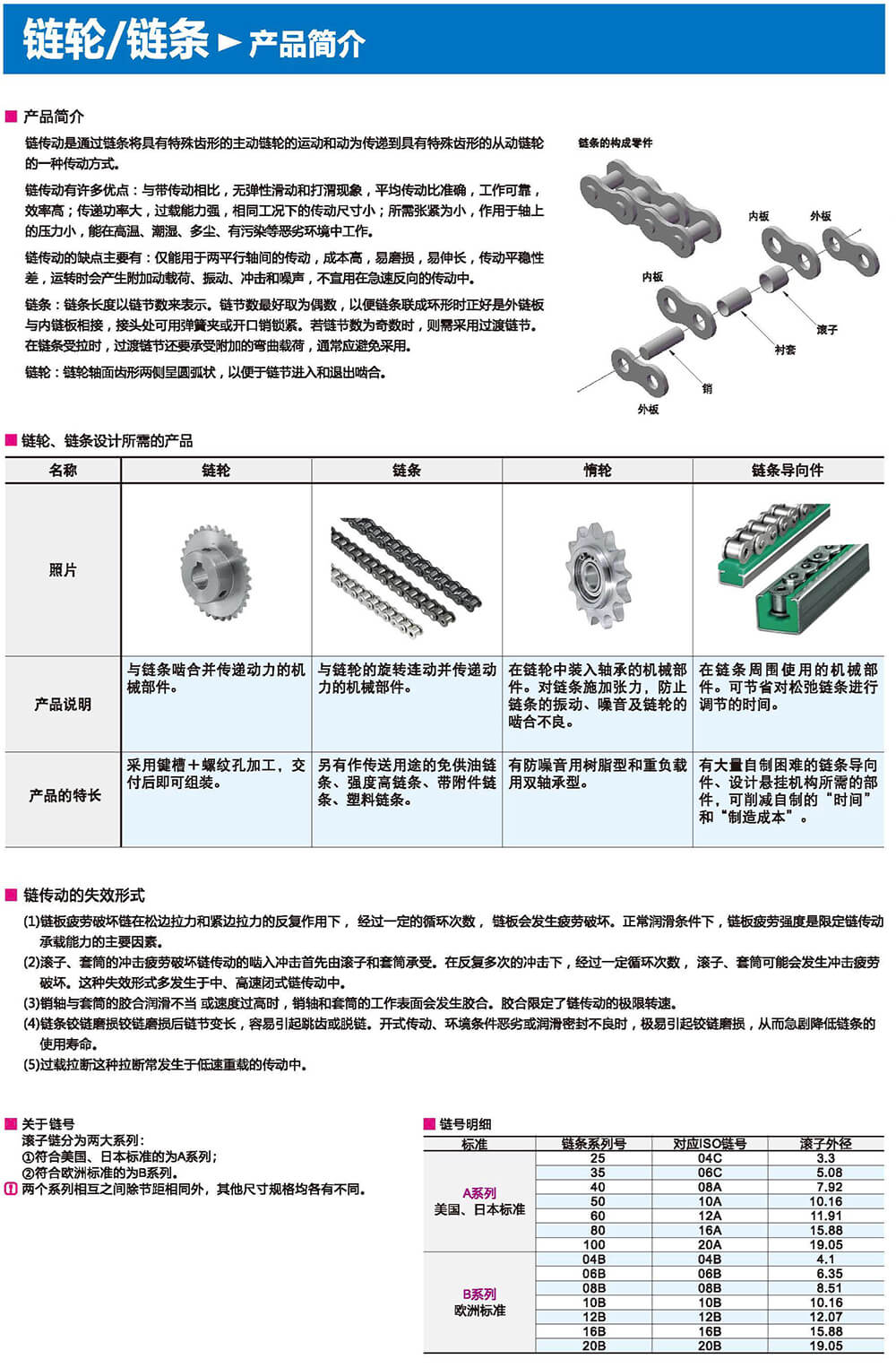 鏈傳動(dòng)是通過(guò)鏈條將具有特殊齒形的主動(dòng)鏈輪的運(yùn)動(dòng)和動(dòng)為傳遞到具有特殊齒形的從動(dòng)鏈輪的一種傳動(dòng)方式。