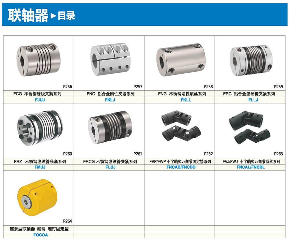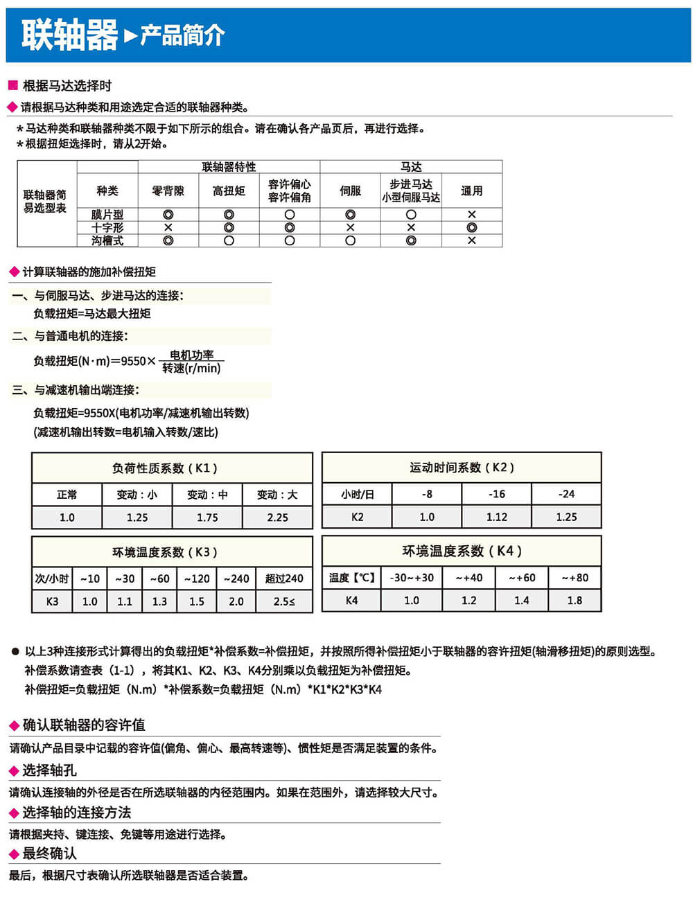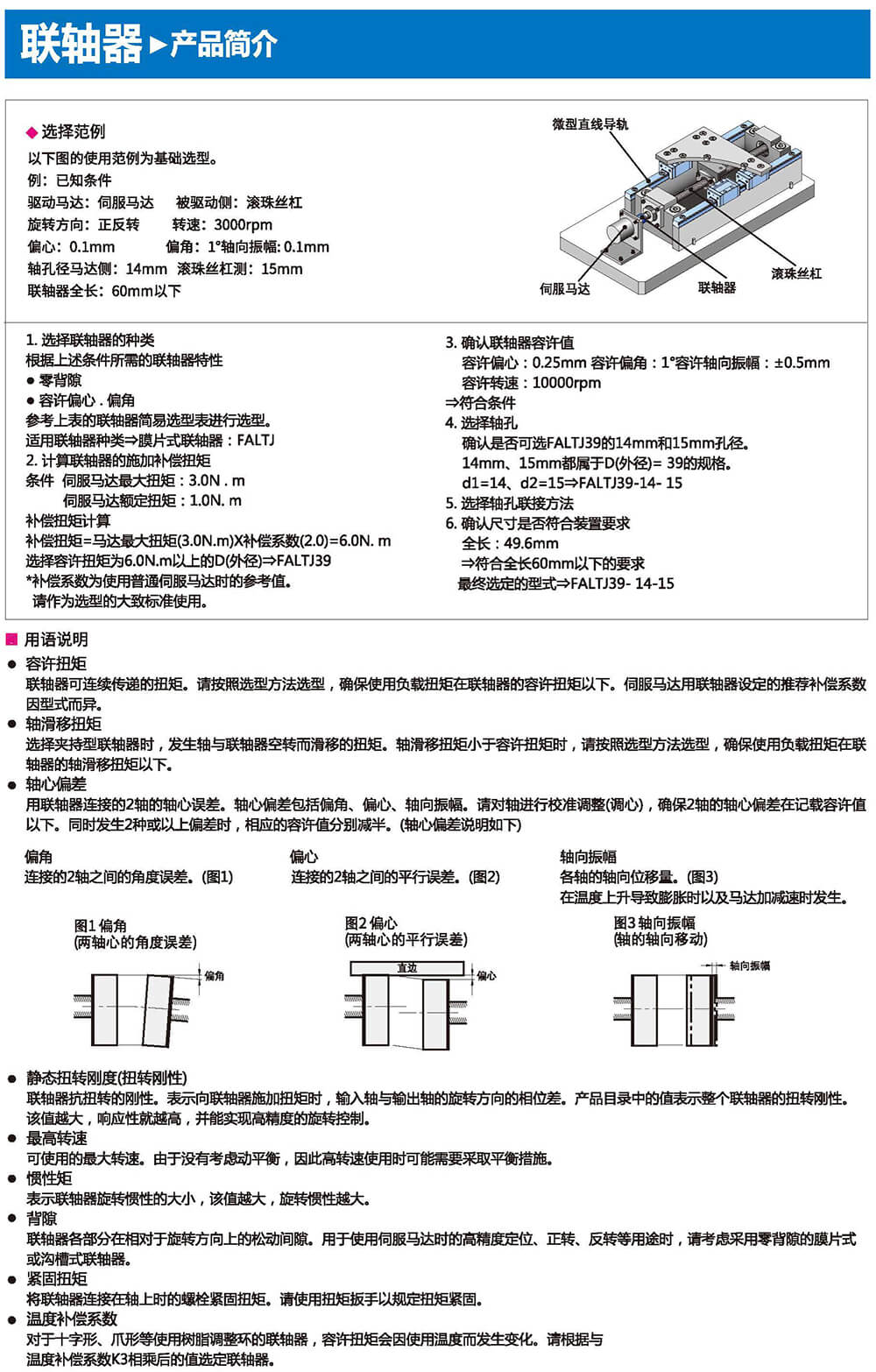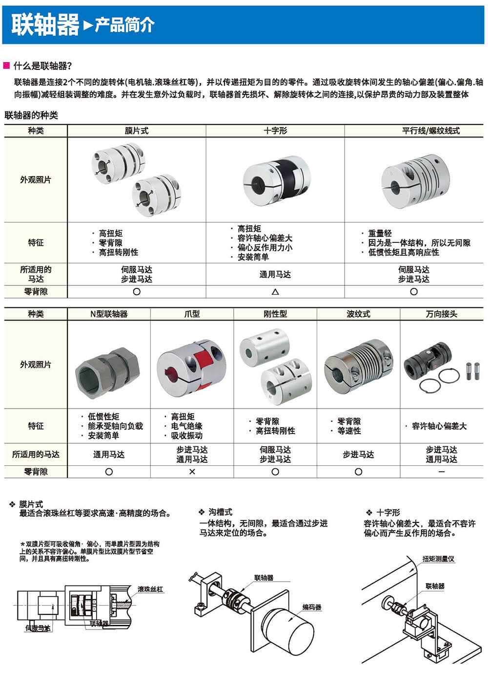 聯(lián)軸器是連接2個不同的旋轉體(電機軸,滾珠絲杠等),并以傳遞扭矩為目的的零件。通過吸收旋轉體間發(fā)生的軸心偏差(偏心.偏角.軸向振幅)減輕組裝調整的難度。并在發(fā)生意外過負載時,聯(lián)軸器首先損壞、解除旋轉體之間的連接,以保護昂貴的動力部及裝置整體。