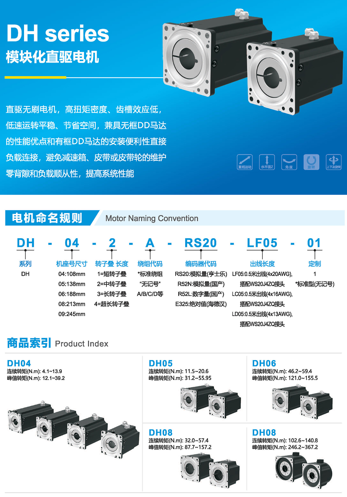 直驅(qū)無刷電機(jī),高扭矩密度、齒槽效應(yīng)低,低速運(yùn)轉(zhuǎn)平穩(wěn)、節(jié)省空間,兼具無框DD馬達(dá)的性能優(yōu)點(diǎn)和有框DD馬達(dá)的安裝便利性直接負(fù)載連接,避免減速箱、皮帶或皮帶輪的維護(hù)零背隙和負(fù)載順從性,提高系統(tǒng)性能.