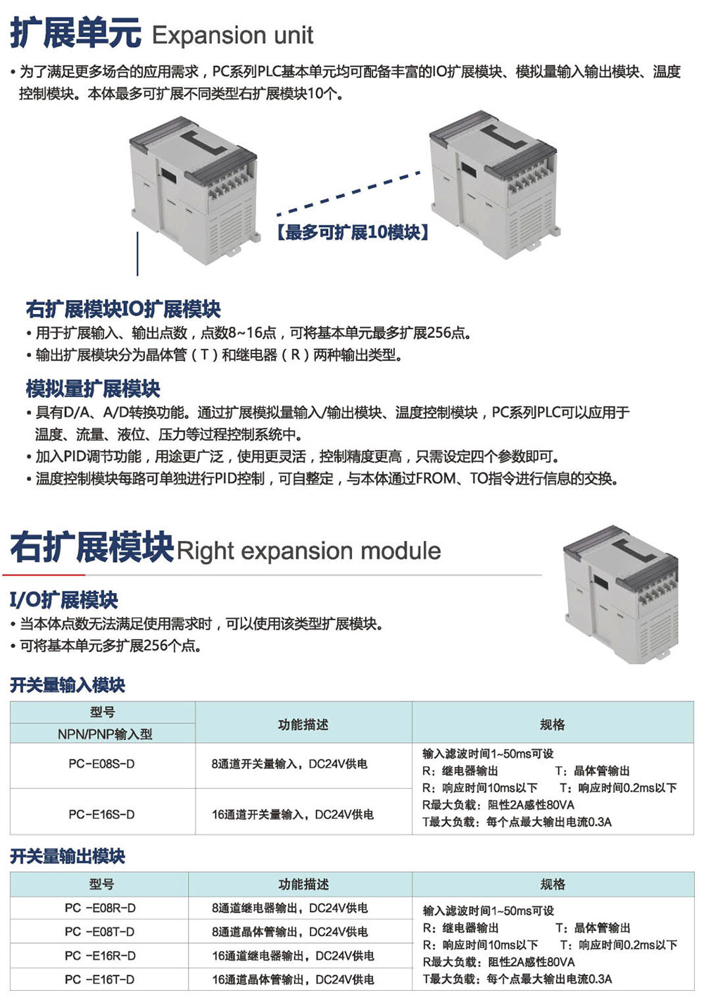 為了滿足更多場(chǎng)合的應(yīng)用需求, PC系列PLC基本單元均可配備豐富的IO擴(kuò)展模塊、模擬量輸入輸出模塊、溫度 控制模塊。本體可擴(kuò)展不同類型右擴(kuò)展模塊10個(gè)。