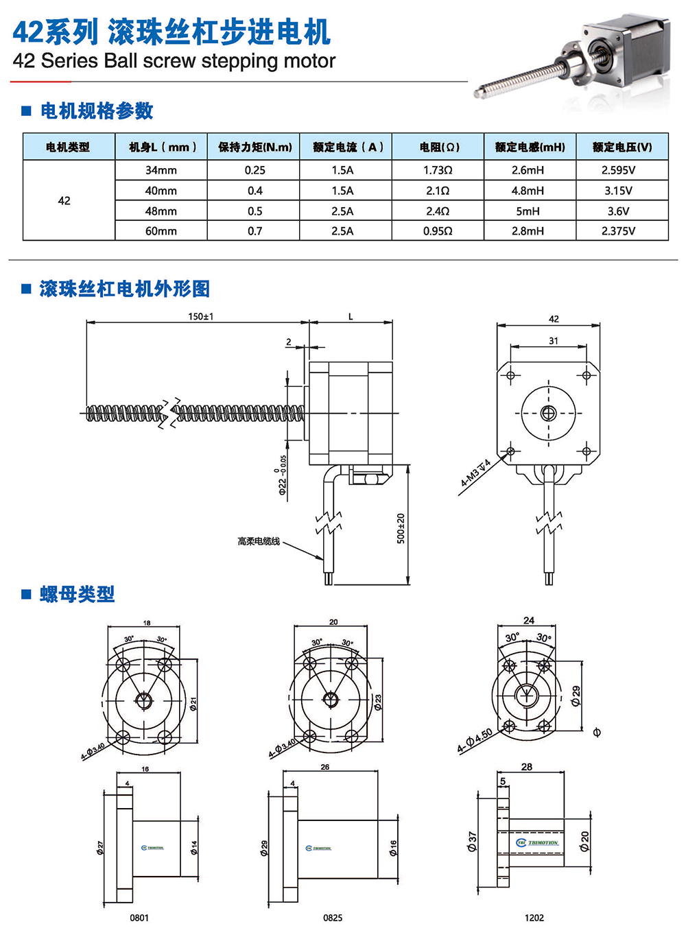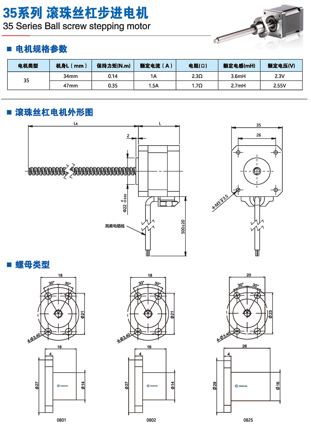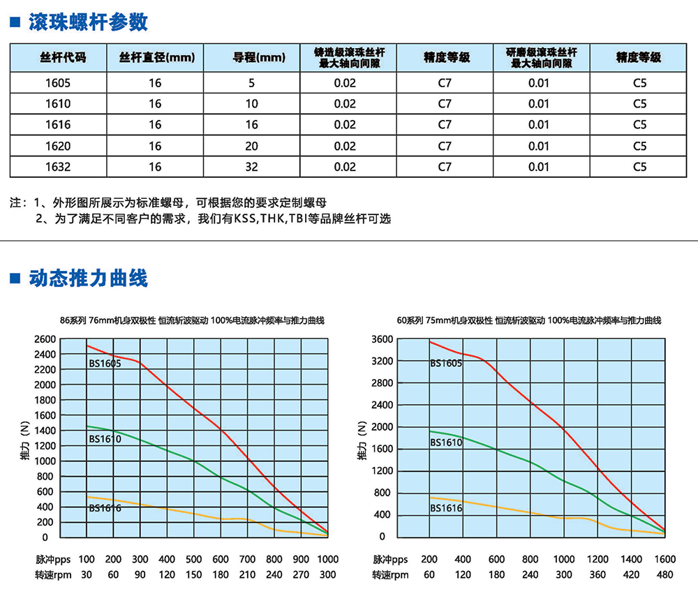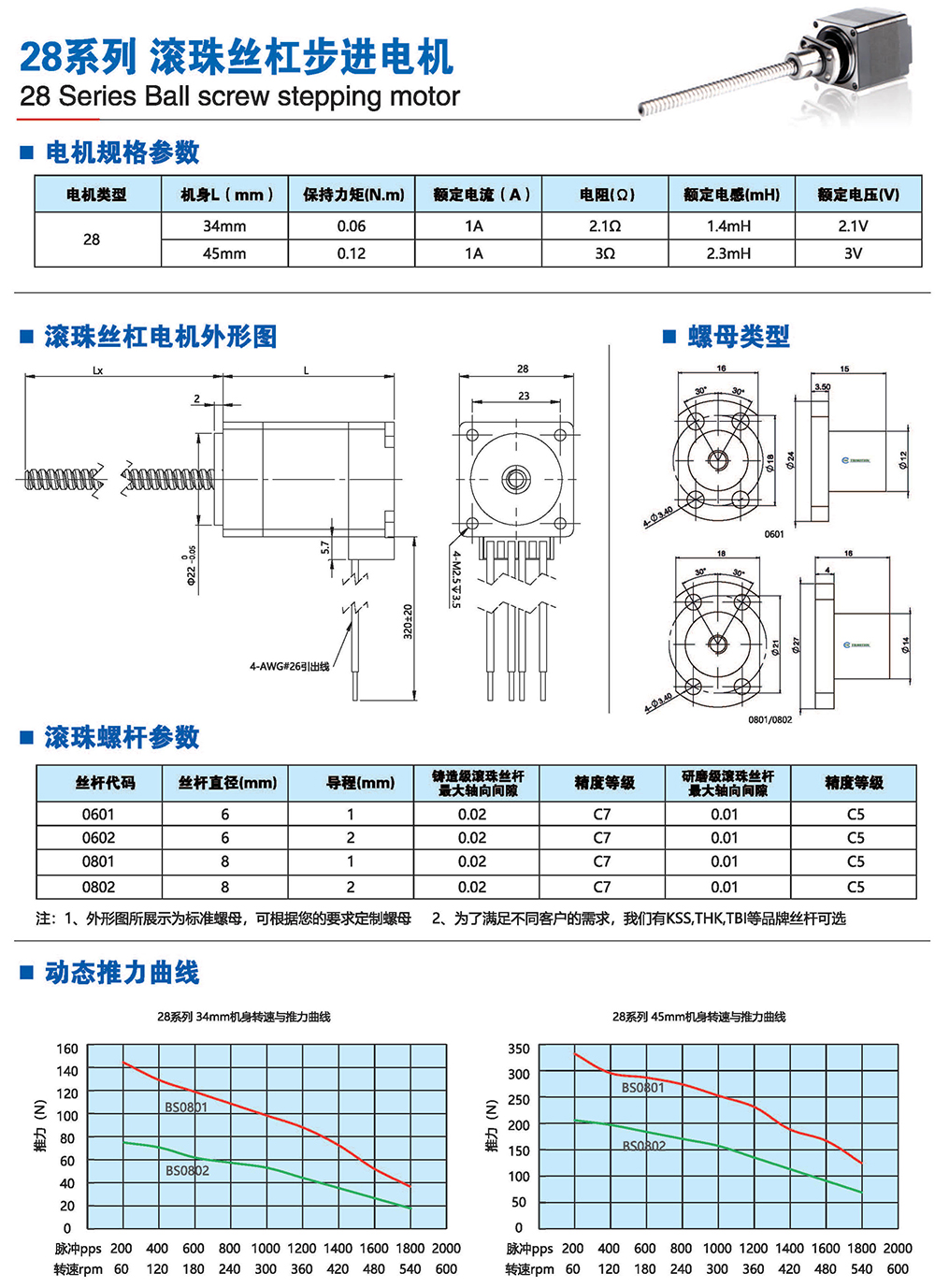 滾珠絲桿步進(jìn)電機(jī)有六種尺寸,外形尺寸從14mm至86mm,滾珠絲桿電機(jī)為外部驅(qū)動(dòng)式。 從0.005mm/步到0. 1mm/步,有多種步長(zhǎng)可選。推力可達(dá)1600N,全系可 選配編碼器。