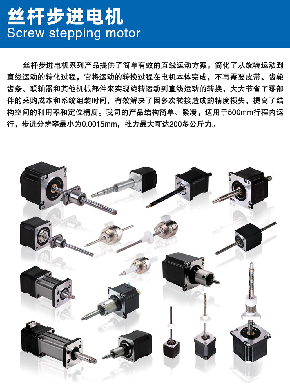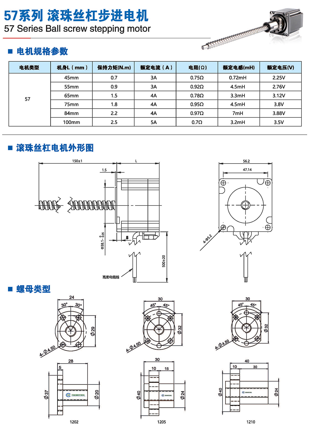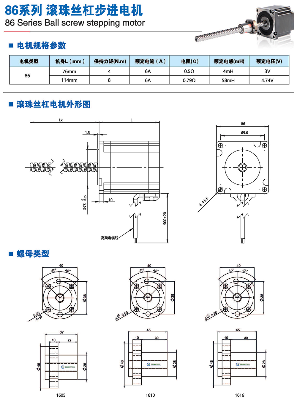 滾珠絲桿步進(jìn)電機(jī)有六種尺寸,外形尺寸從14mm至86mm,滾珠絲桿電機(jī)為外部驅(qū)動(dòng)式。 從0.005mm/步到0. 1mm/步,有多種步長(zhǎng)可選。推力可達(dá)1600N,全系可 選配編碼器。