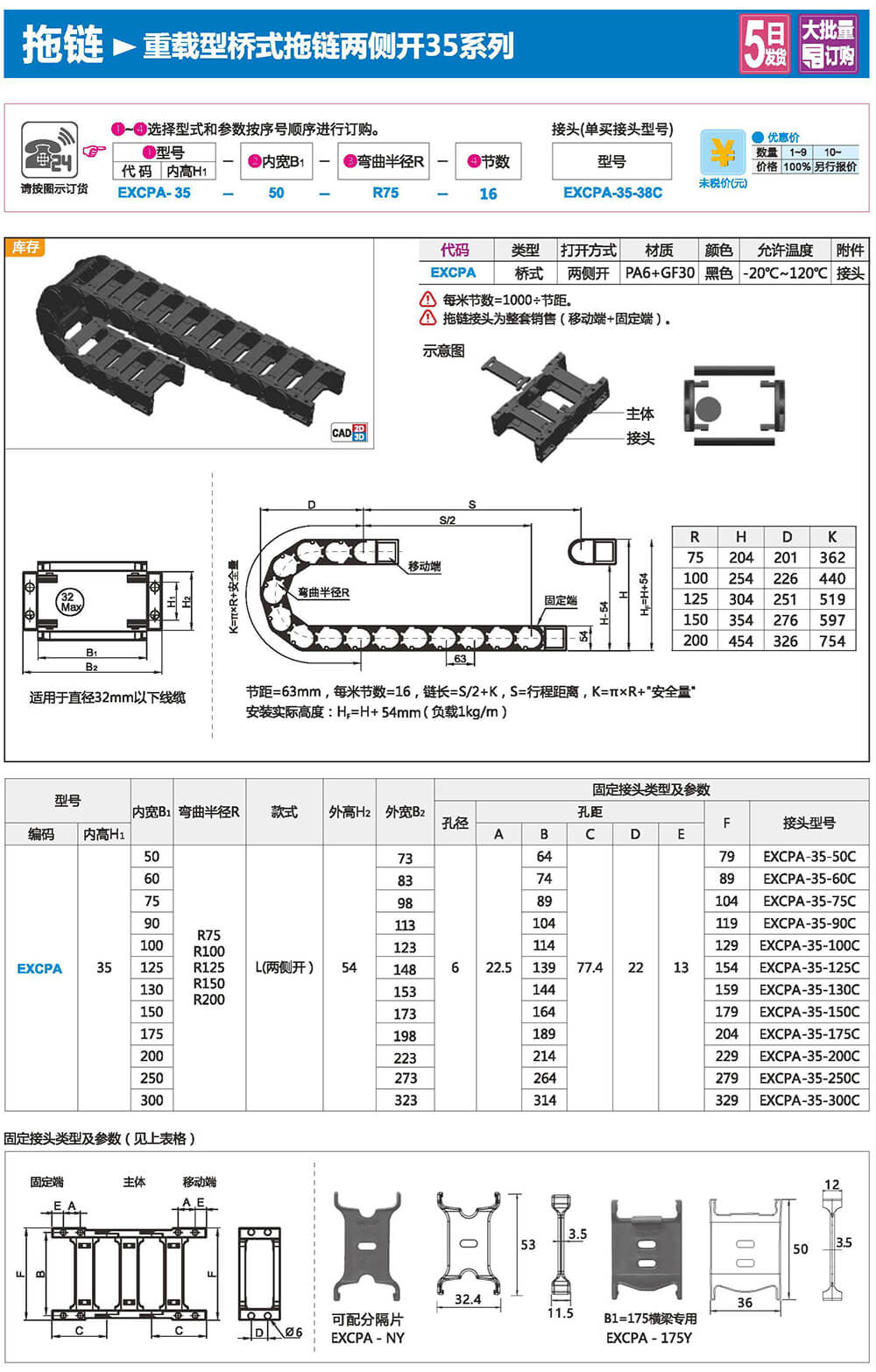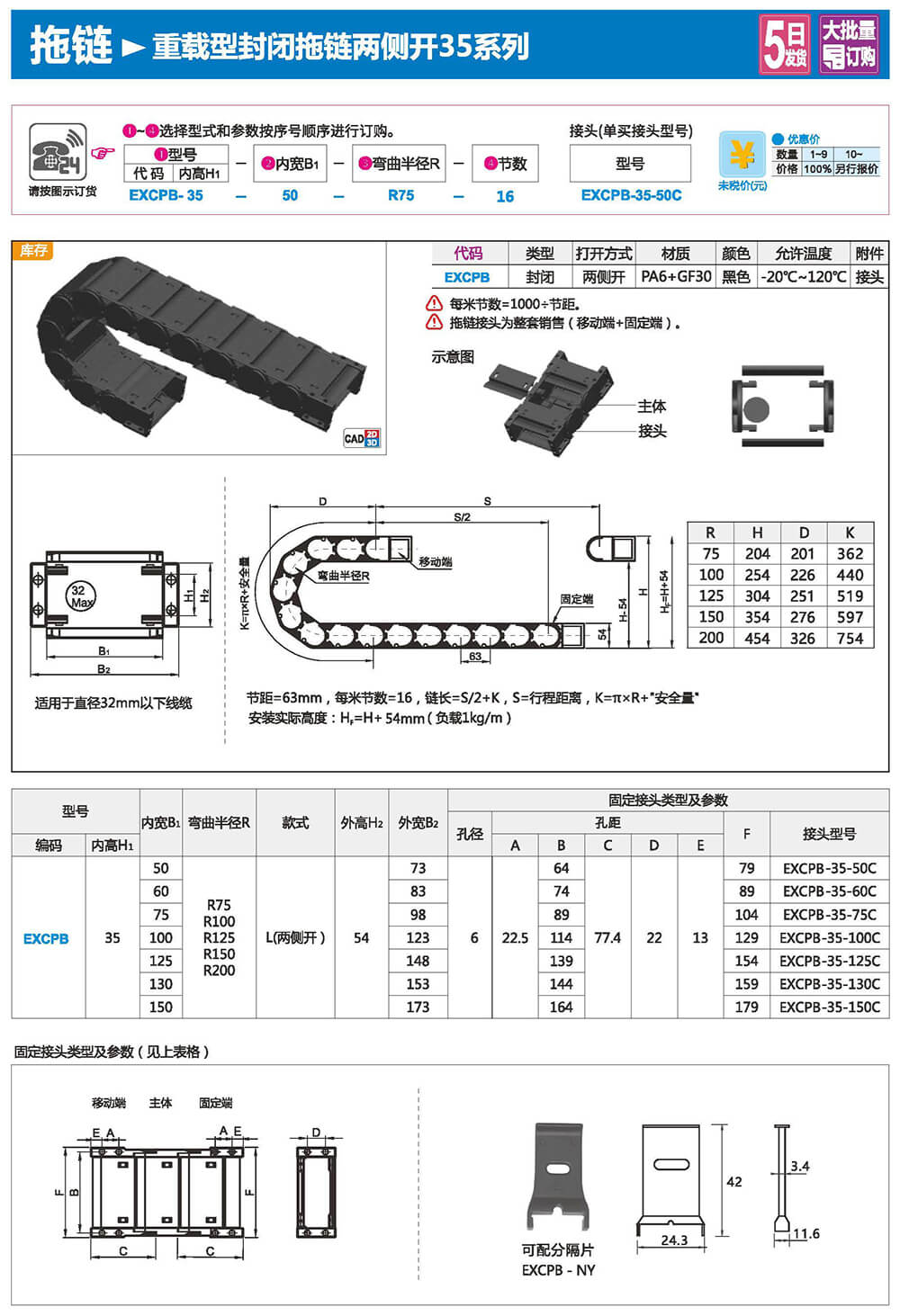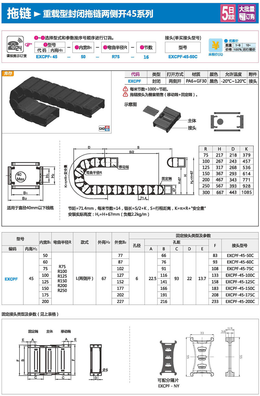 適合于使用在往復(fù)運(yùn)動的場合,能夠?qū)?nèi)置的電纜、油管、氣管、水管等起到牽引和保護(hù)作用,拖鏈每節(jié)都能打開,便于安裝和維修。運(yùn)動時噪音低、耐磨、可高速運(yùn)動。拖鏈已被廣泛應(yīng)用于數(shù)控機(jī)床.電子設(shè)備、石材機(jī)械、玻璃機(jī)械、門窗機(jī)械、注塑機(jī)、機(jī)械手、起重運(yùn)輸設(shè)備、自動化倉庫等。