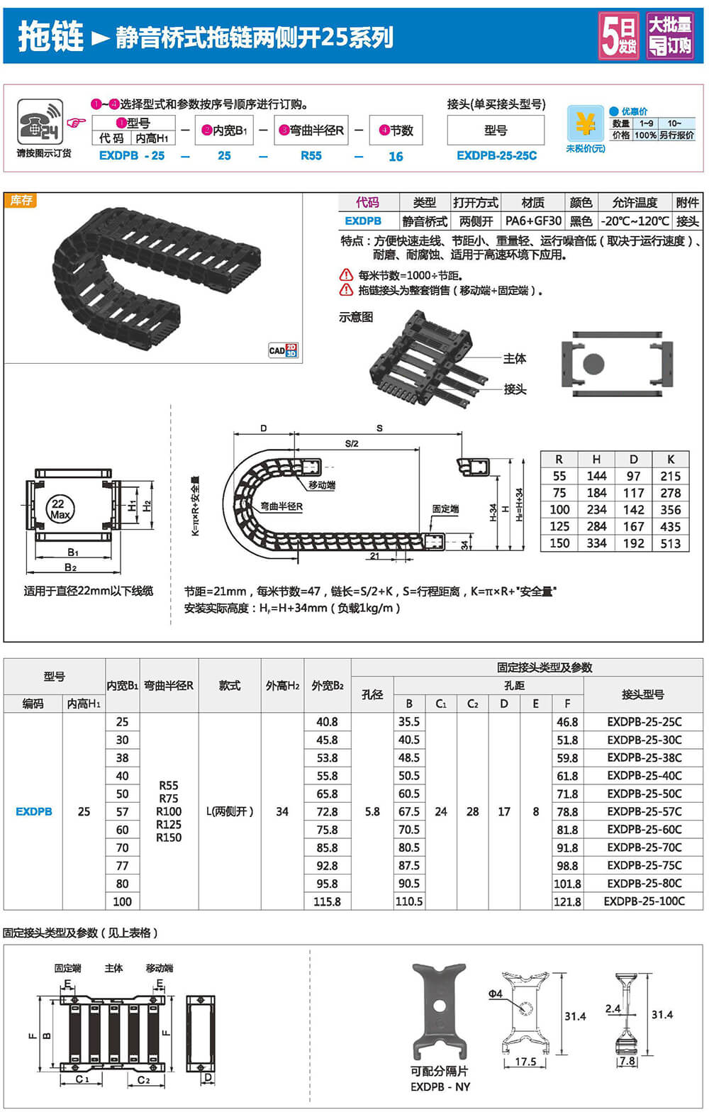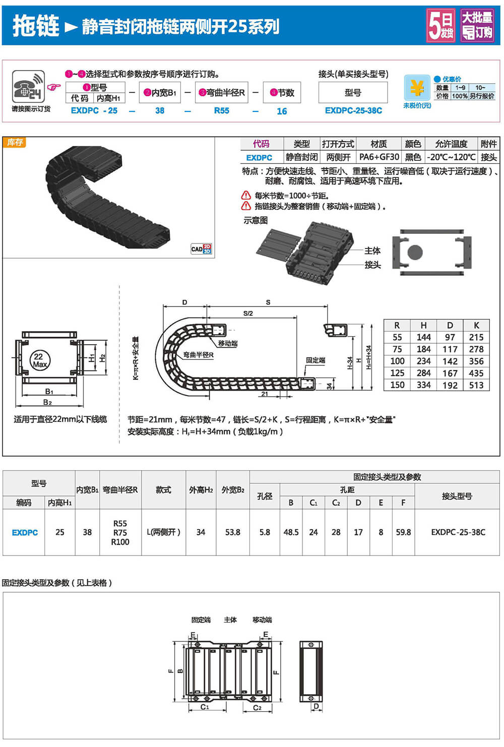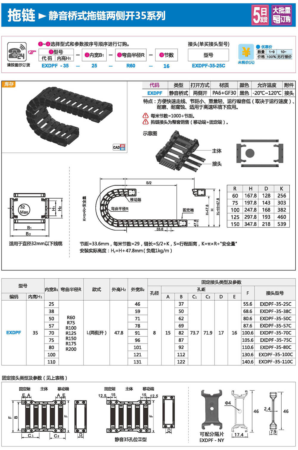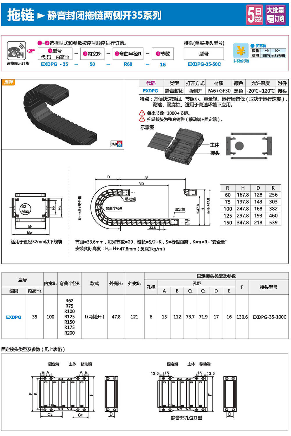 適合于使用在往復(fù)運(yùn)動(dòng)的場(chǎng)合,能夠?qū)?nèi)置的電纜、油管、氣管、水管等起到牽引和保護(hù)作用,拖鏈每節(jié)都能打開,便于安裝和維修。運(yùn)動(dòng)時(shí)噪音低、耐磨、可高速運(yùn)動(dòng)。拖鏈已被廣泛應(yīng)用于數(shù)控機(jī)床.電子設(shè)備、石材機(jī)械、玻璃機(jī)械、門窗機(jī)械、注塑機(jī)、機(jī)械手、起重運(yùn)輸設(shè)備、自動(dòng)化倉庫等。
