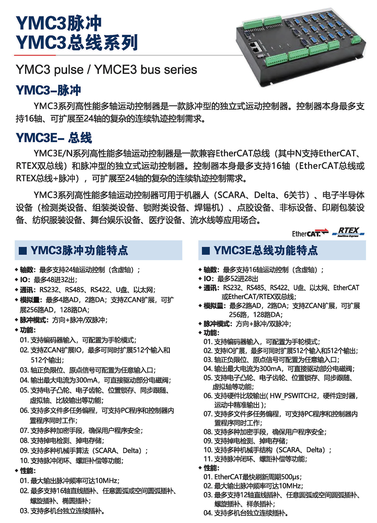 YMC3E/N系列高性能多軸運(yùn)動(dòng)控制器是一款兼容EtherCAT總線 (其中N支持EtherCAT.RTEX雙總線)和脈沖型的獨(dú)立式運(yùn)動(dòng)控制器??刂破鞅旧碜疃嘀С?6軸( EtherCAT總線或RTEX總線+脈沖) , 可擴(kuò)展至24軸的復(fù)雜的連續(xù)軌跡控制需求。