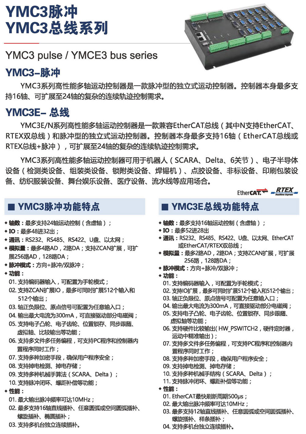 YMC3E/N系列高性能多軸運動控制器是一款兼容EtherCAT總線 (其中N支持EtherCAT.RTEX雙總線)和脈沖型的獨立式運動控制器。控制器本身最多支持16軸( EtherCAT總線或RTEX總線+脈沖) , 可擴展至24軸的復(fù)雜的連續(xù)軌跡控制需求。