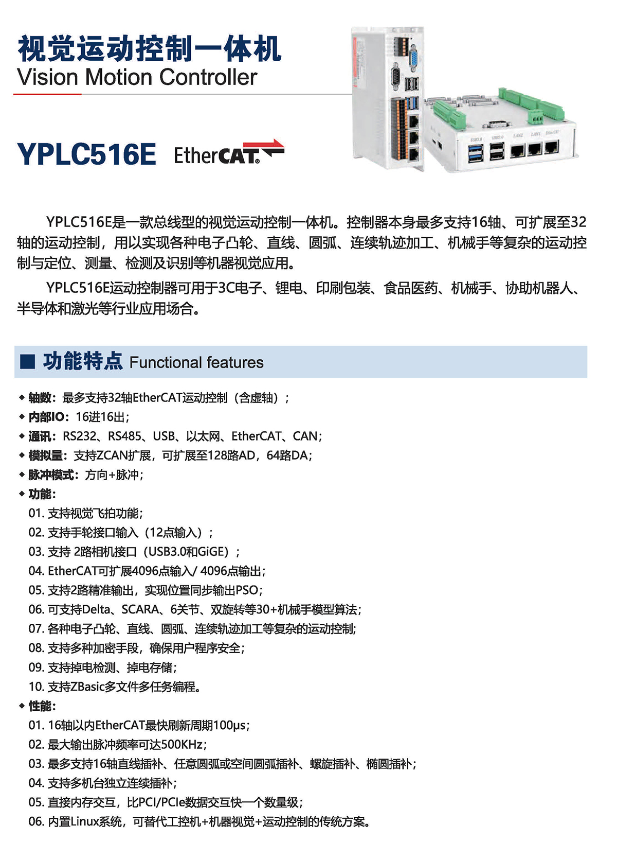 YPLC516E是一款總線型的視覺運動控制一體機。控制器本身最多支持16軸、可擴展至32軸的運動控制,用以實現(xiàn)各種電子凸輪、直線、圓弧、連續(xù)軌跡加工、機械手等復雜的運動控