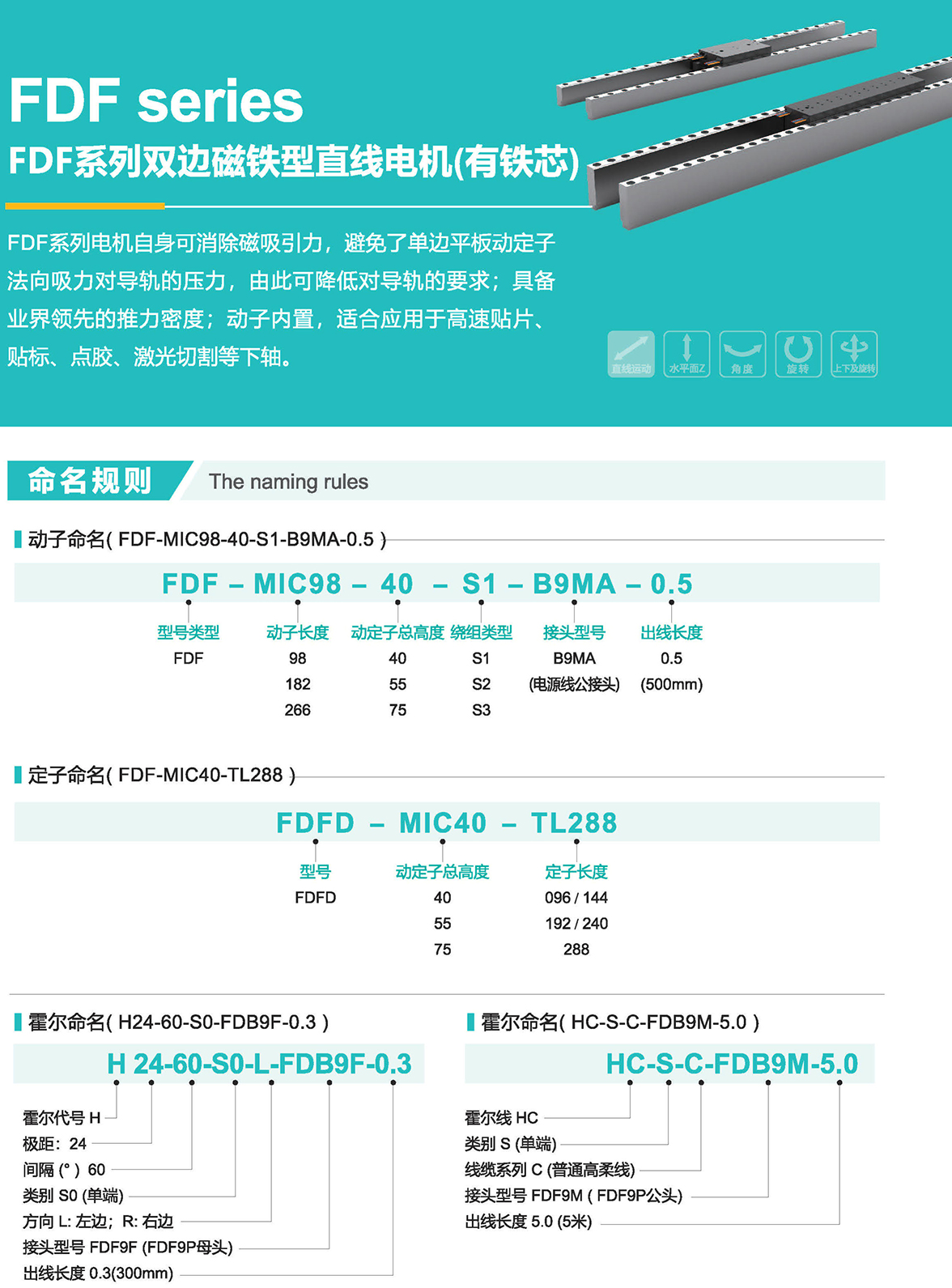 FDF系列電機(jī)自身可消除磁吸引力,避免了單邊平板動(dòng)定子法向吸力對(duì)導(dǎo)軌的壓力,由此可降低對(duì)導(dǎo)軌的要求;具備業(yè)界領(lǐng)先的推力密度;動(dòng)內(nèi)置,適合應(yīng)用于高速貼片、貼標(biāo)、點(diǎn)膠、激光切割等下軸。