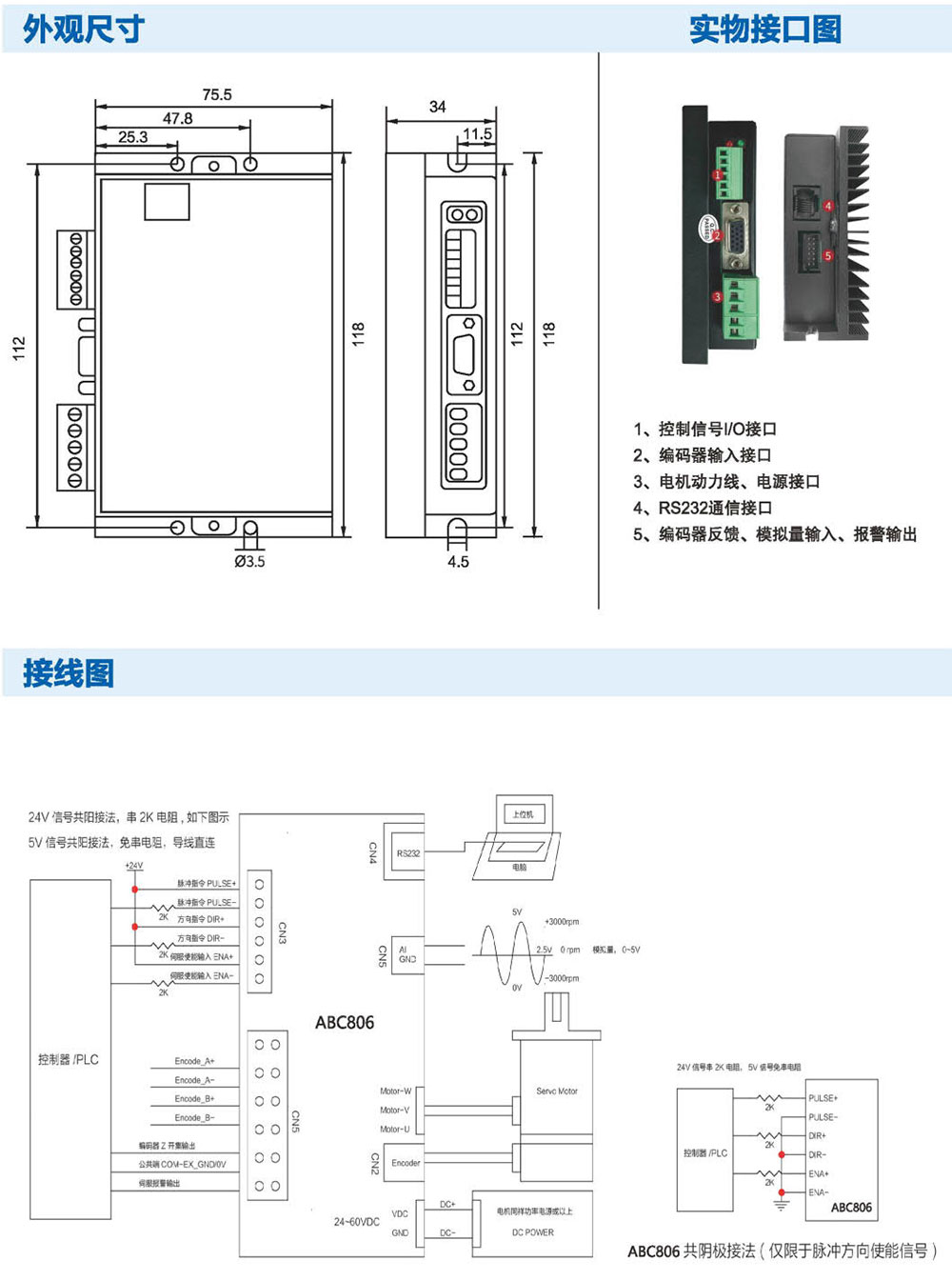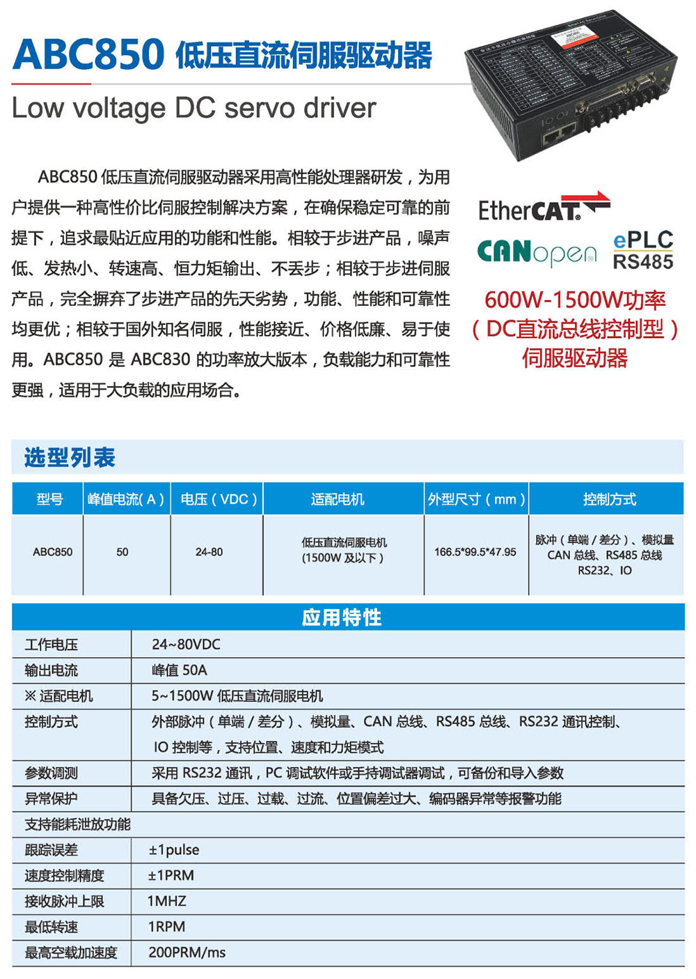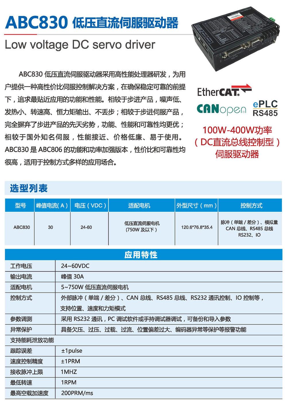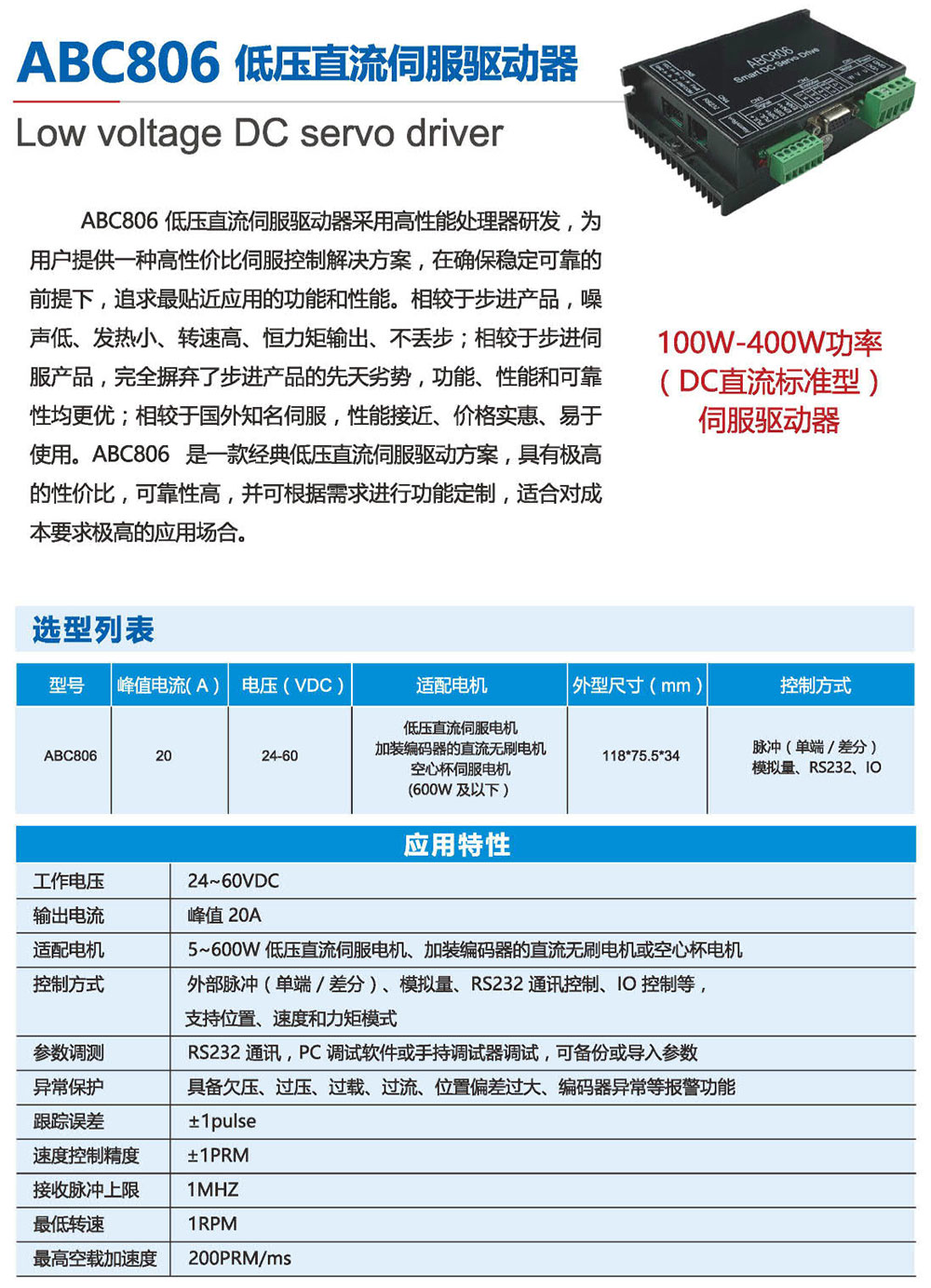 ABC306低壓直流伺服驅(qū)動(dòng)器采用高性能處理器研發(fā),為 用戶提供一種高性價(jià)比伺服控制解決方案,在確保穩(wěn)定可靠的 前提下,追求貼近應(yīng)用的功能和性能。相較于步進(jìn)產(chǎn)品,噪 聲低、發(fā)熱小、轉(zhuǎn)速高、恒力矩輸出、不丟步;相較于步進(jìn)伺 服產(chǎn)品,摒棄了步進(jìn)產(chǎn)品的先天劣勢(shì),功能、性能和可靠 性均更優(yōu);相較于國(guó)外知名伺服,性能接近、價(jià)格低廉、易于 使用。ABC306外形小巧,功能強(qiáng)大,特別適用于高性能運(yùn)動(dòng) 要求和安裝空間狹小的應(yīng)用場(chǎng)合,并可根據(jù)需求進(jìn)行功能定 制,是一款高性價(jià)比伺服驅(qū)動(dòng)方案。