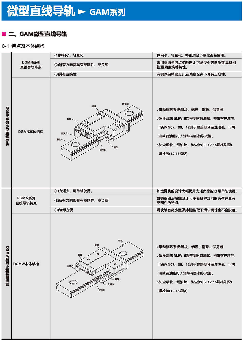 直線導(dǎo)軌由鋼珠在滑塊與滑軌之間作無限滾動循環(huán)負載平臺能沿著滑軌輕易地以高精度做線性運動。與傳統(tǒng)的滑動導(dǎo)引相比較滾動引導(dǎo)的摩擦系數(shù)可降低至1/50,由于啟動的摩擦力大大減少,相對的較少無效運動發(fā)生故而能輕易達到μum級進給及定位。在加上滑塊與滑軌的束制單元設(shè)計,使得線性導(dǎo)軌可同時承受上下左右等各個方向的負荷上述陳列特點并非傳統(tǒng)滑動導(dǎo)引所能比擬因此機臺若能配合滾珠螺桿,使用線性導(dǎo)軌作導(dǎo)引必能大幅提高設(shè)備精度與機械效能。