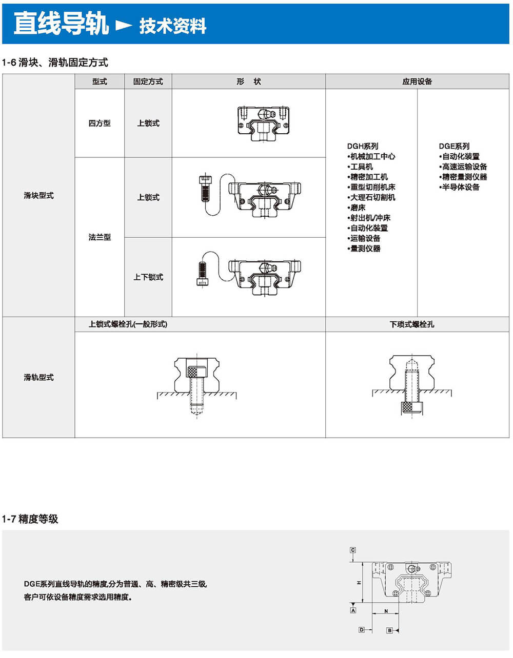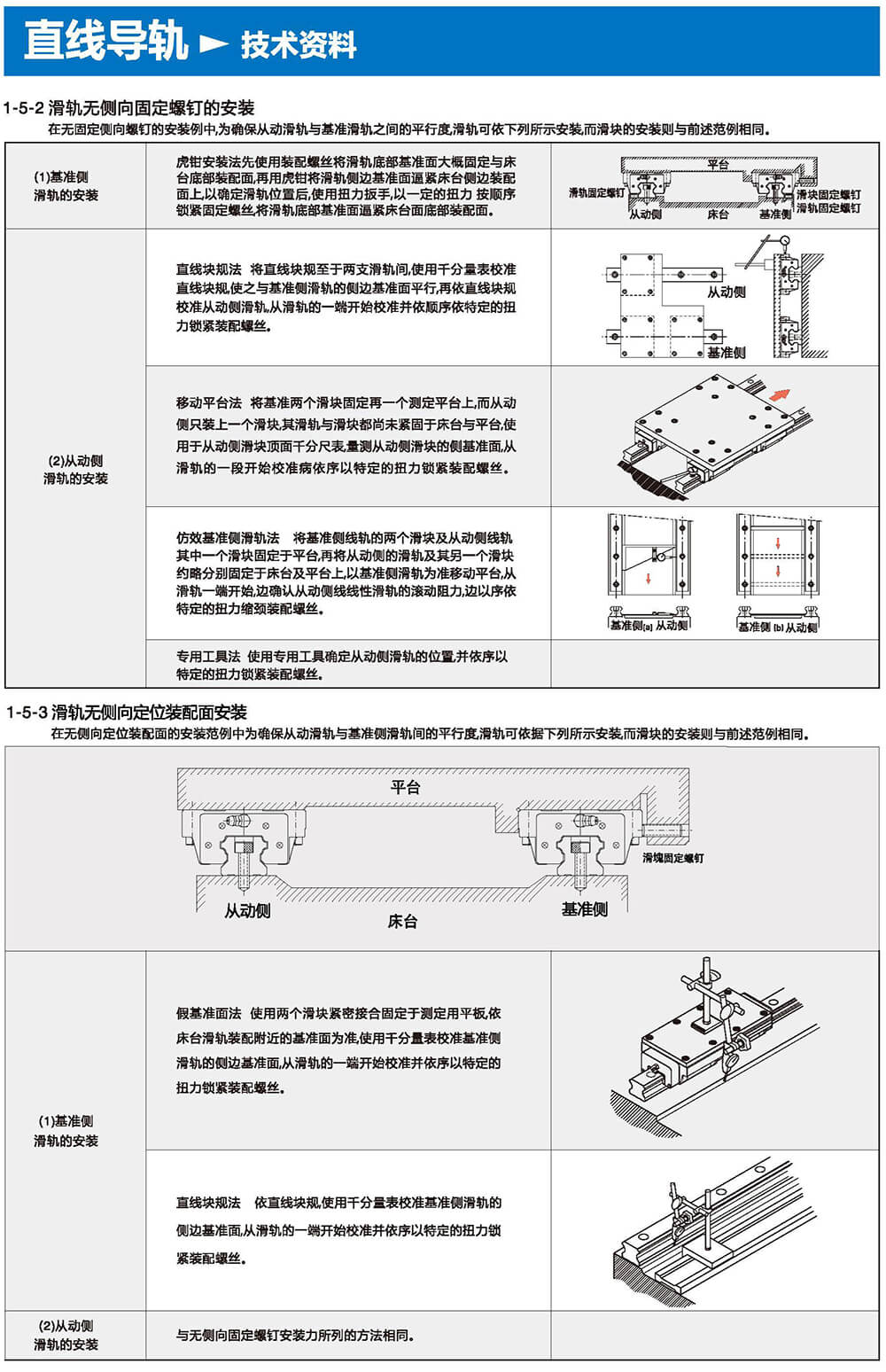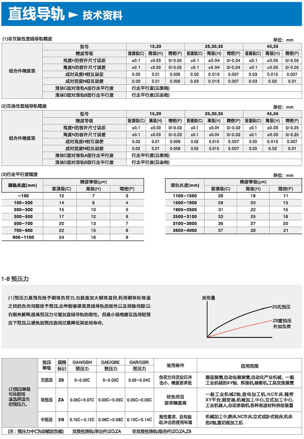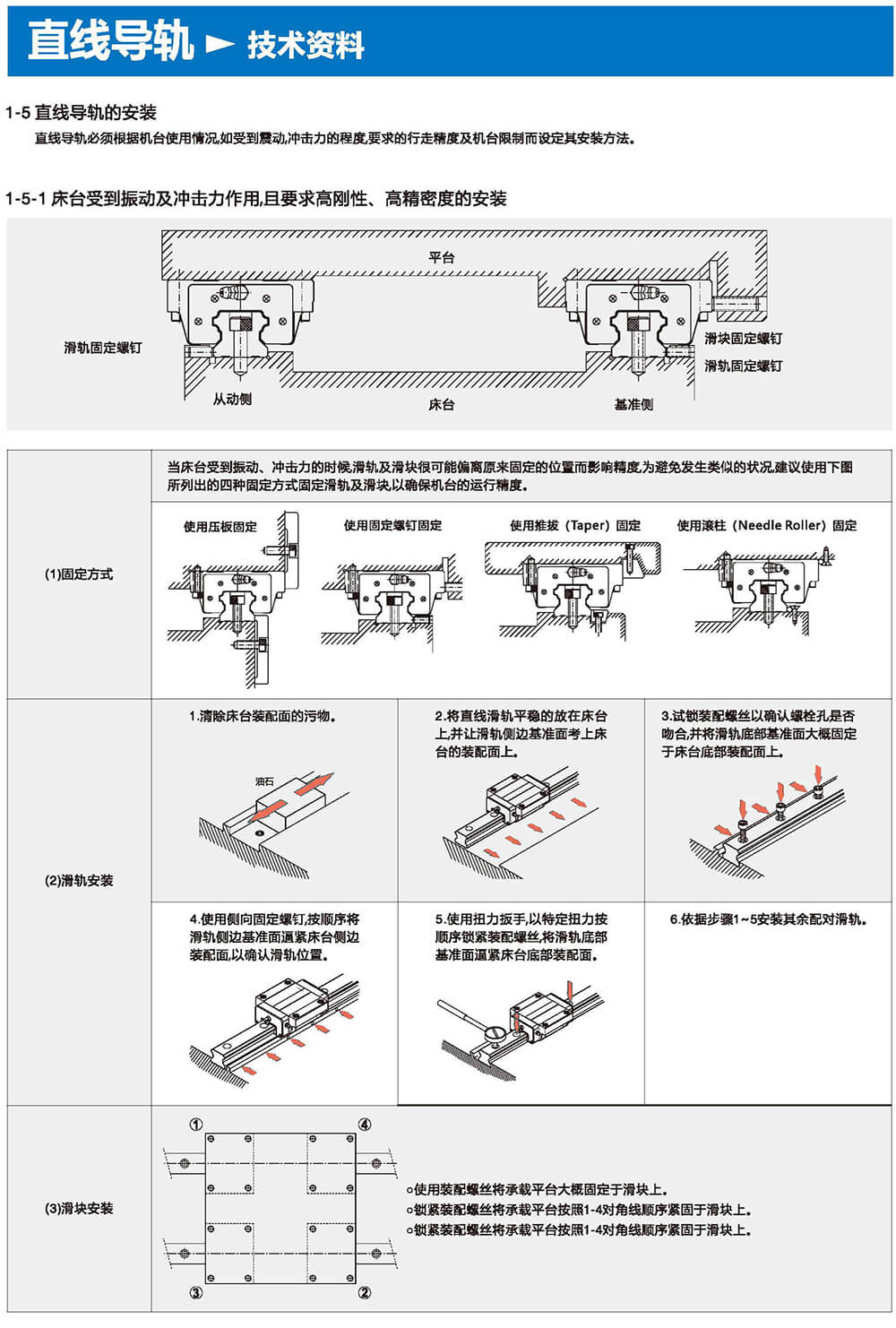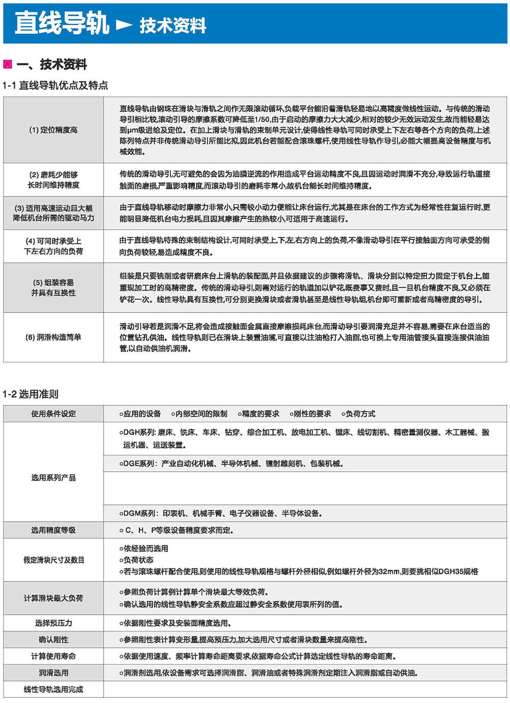 直線導(dǎo)軌由鋼珠在滑塊與滑軌之間作無限滾動循環(huán)負(fù)載平臺能沿著滑軌輕易地以高精度做線性運(yùn)動。與傳統(tǒng)的滑動導(dǎo)引相比較滾動引導(dǎo)的摩擦系數(shù)可降低至1/50,由于啟動的摩擦力大大減少,相對的較少無效運(yùn)動發(fā)生故而能輕易達(dá)到μum級進(jìn)給及定位。在加上滑塊與滑軌的束制單元設(shè)計(jì),使得線性導(dǎo)軌可同時(shí)承受上下左右等各個(gè)方向的負(fù)荷上述陳列特點(diǎn)并非傳統(tǒng)滑動導(dǎo)引所能比擬因此機(jī)臺若能配合滾珠螺桿,使用線性導(dǎo)軌作導(dǎo)引必能大幅提高設(shè)備精度與機(jī)械效能。