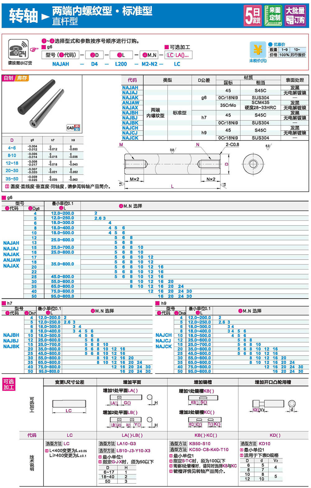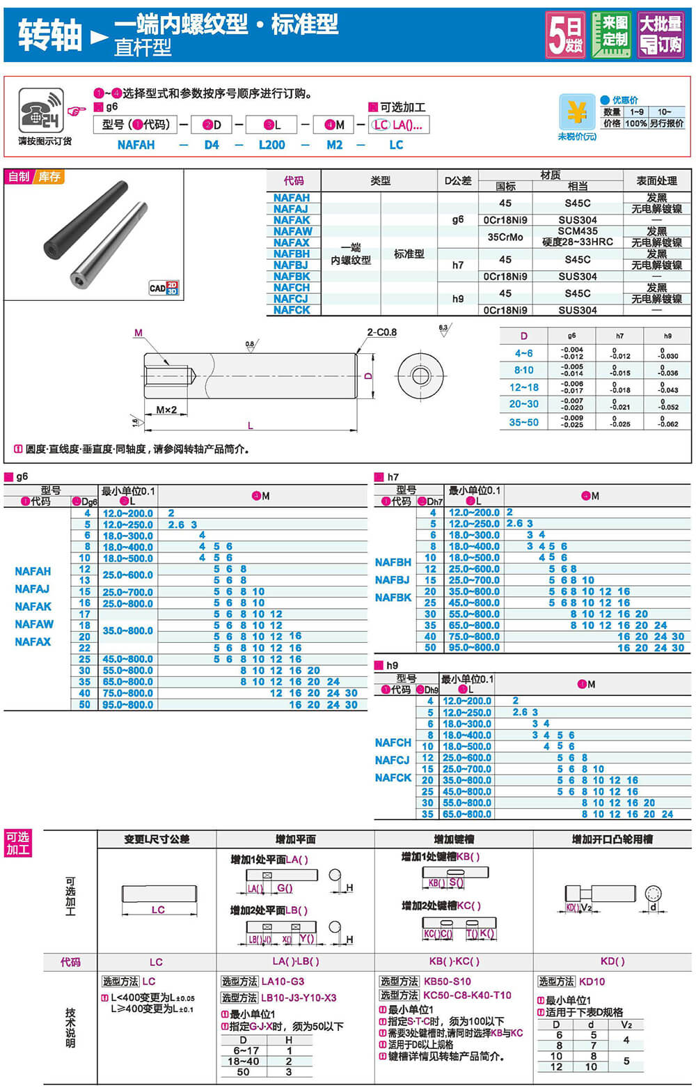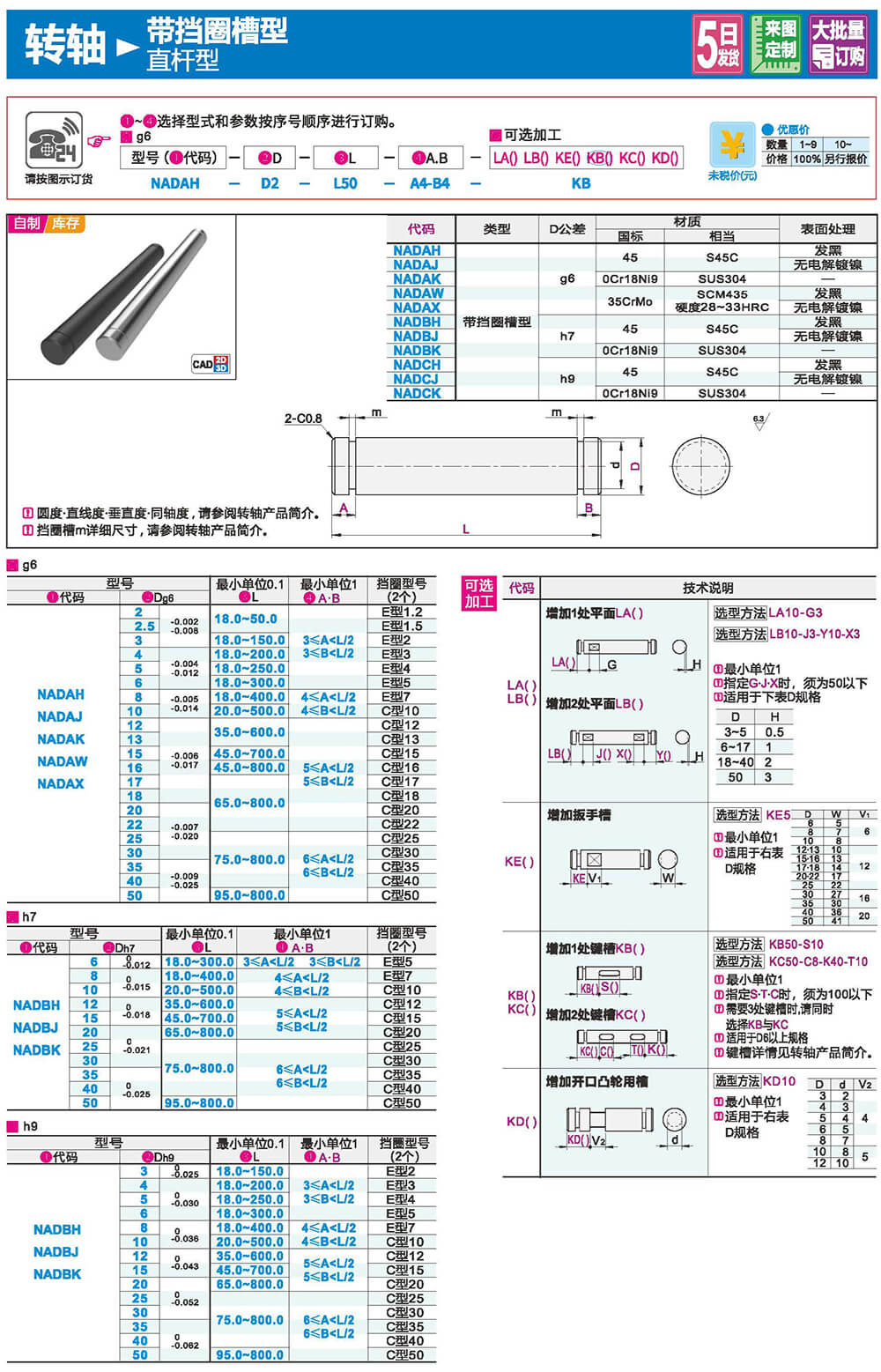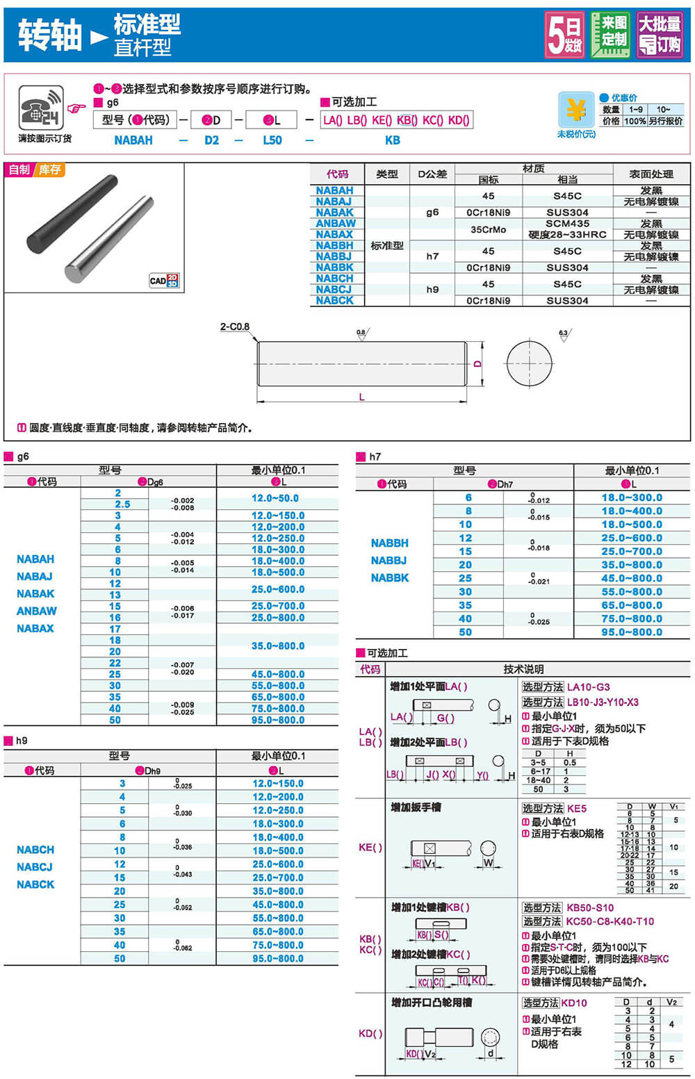 用于傳遞動力、傳送物體等旋轉用途的軸。可作為軸承、帶輪、滾輪的軸使用。 備有便于組裝的h9、h7。g6公差??勺芳渔I槽、扣環(huán)槽。平面、扳手槽等加工。