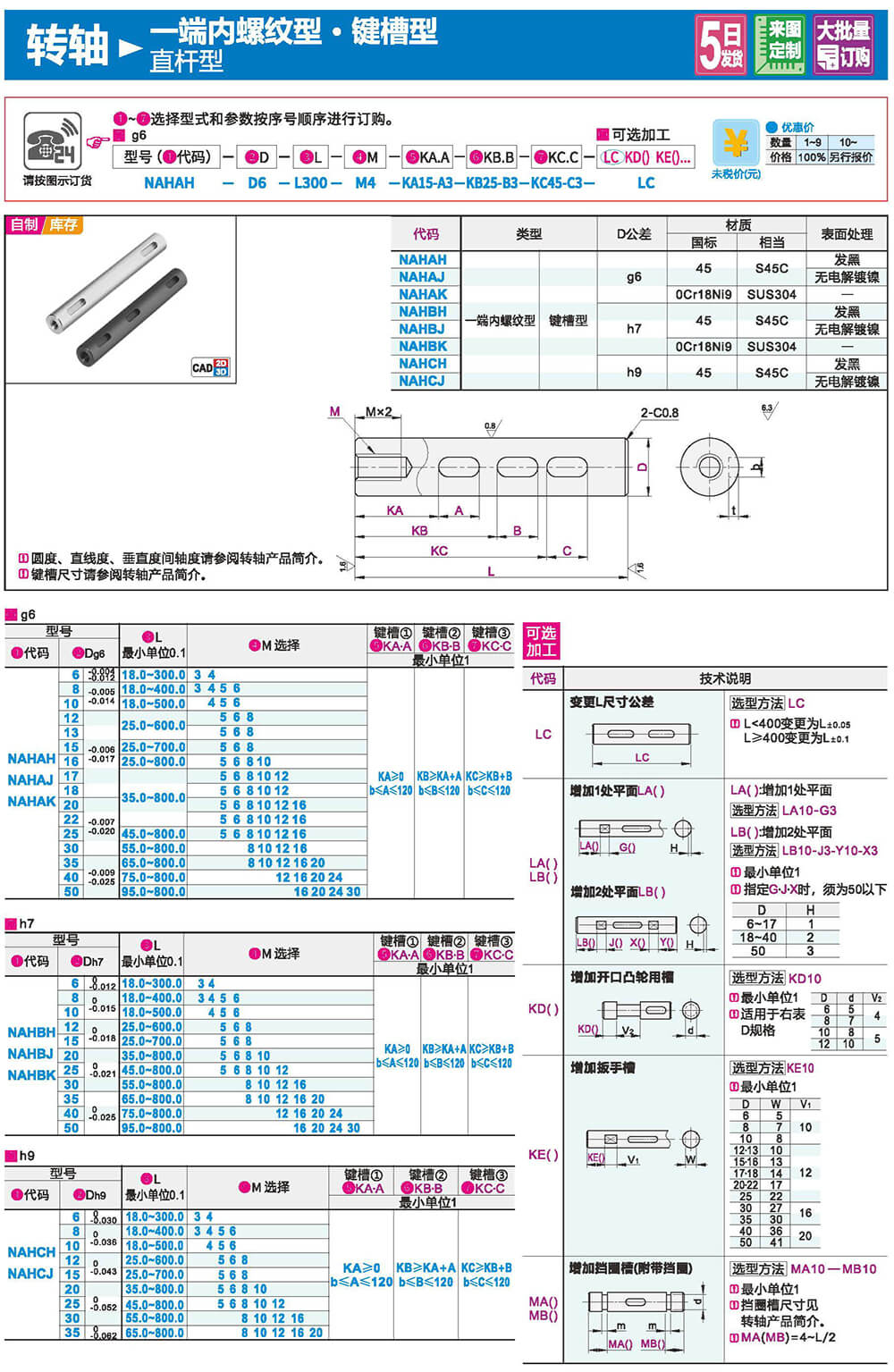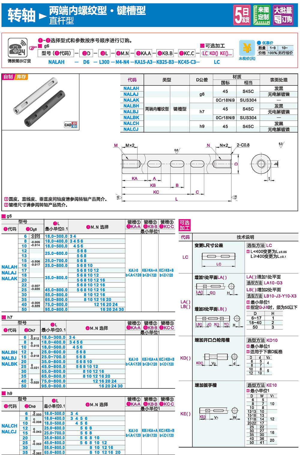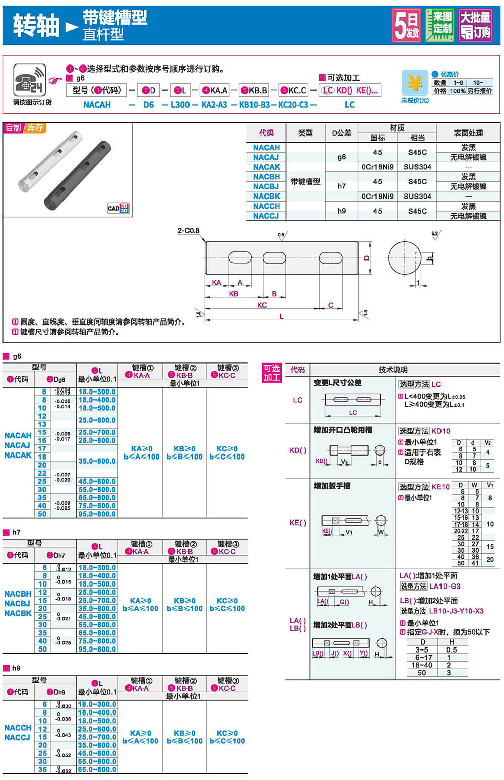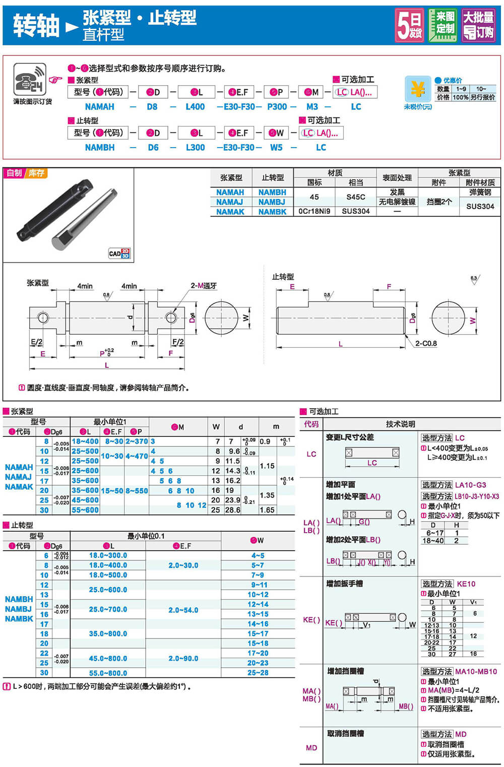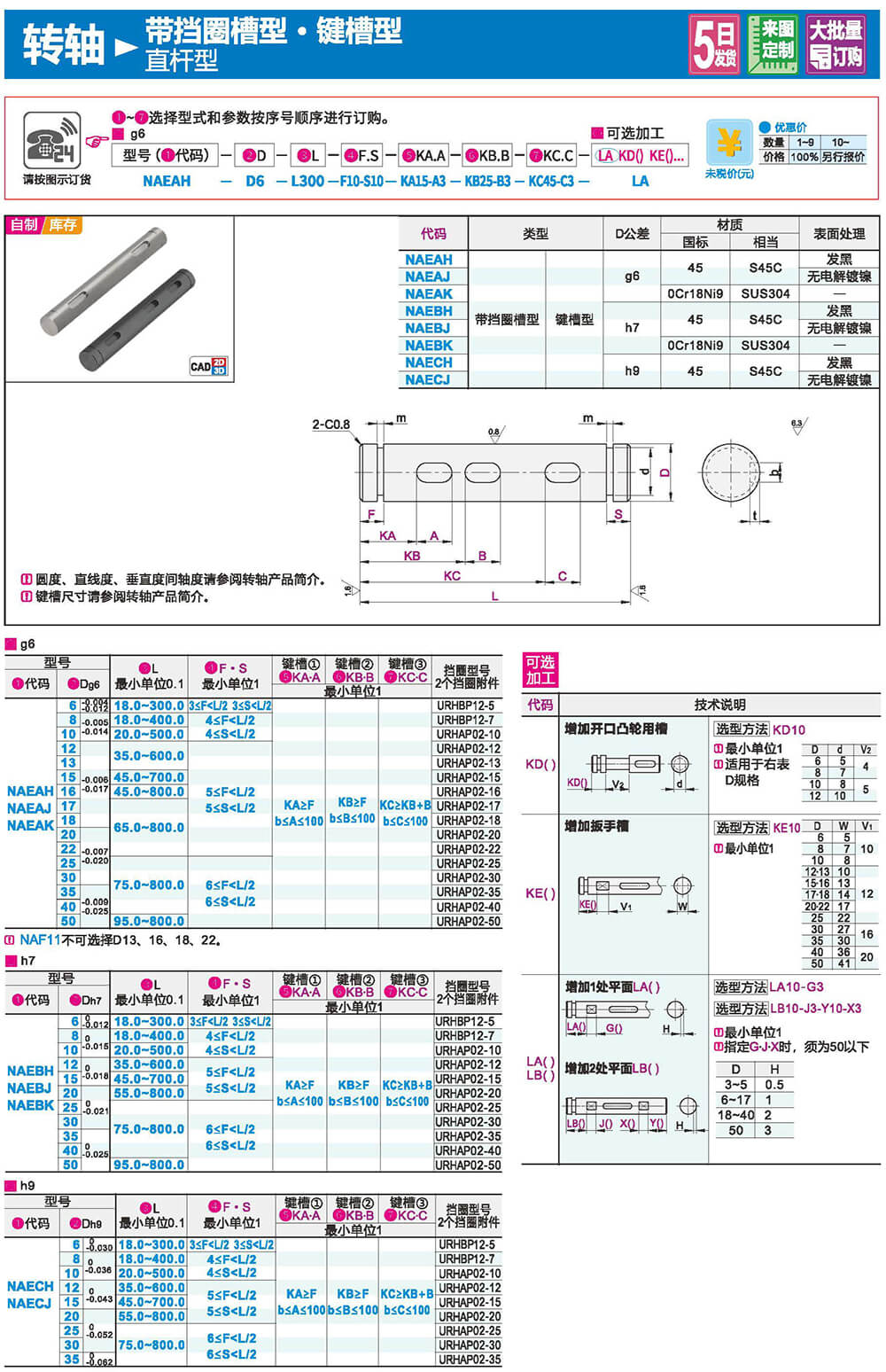 用于傳遞動力、傳送物體等旋轉用途的軸。可作為軸承、帶輪、滾輪的軸使用。 備有便于組裝的h9、h7。g6公差??勺芳渔I槽、扣環(huán)槽。平面、扳手槽等加工。
